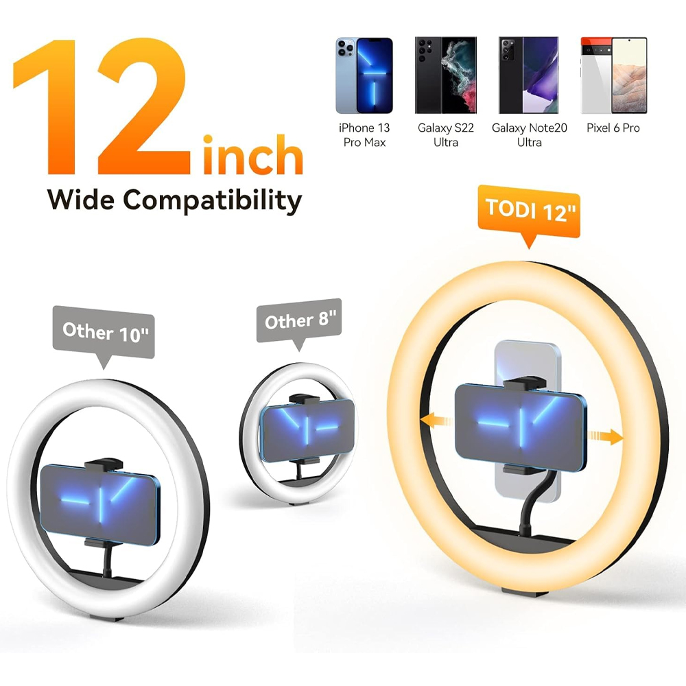 - 【12″ Large Size For Phone】: Upgrade to larger ring 12″ Ring Light, fits well for all mobile phones between 4”-7” in width and most thick case. For example, you can use ring light tripod for iPhone 15pro/15/14/13/12/X/ Xs/ 8 plus/ 8/ 7 plus/ 7/ 6s plus, Samsung Galaxy S10/ S10e/ S9/ S8, Samsung note 4/5/6/7/8/9 Google Pixel 2XL, LG G6 etc.