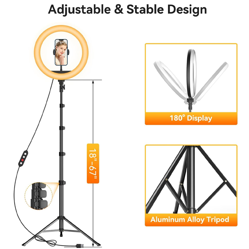 - 【Adjustable 63″ Phone Tripod】: Extending from 18 inches to 63 inches, aluminum alloy weighted tripod bases for increased stability and prevents tipping over. Soft Material designs for phone holder, allows for 360° rotation that provides infinite viewing angles. Position your Ring Light at the perfect angle to enjoy a more relaxed and comfortable lighting.