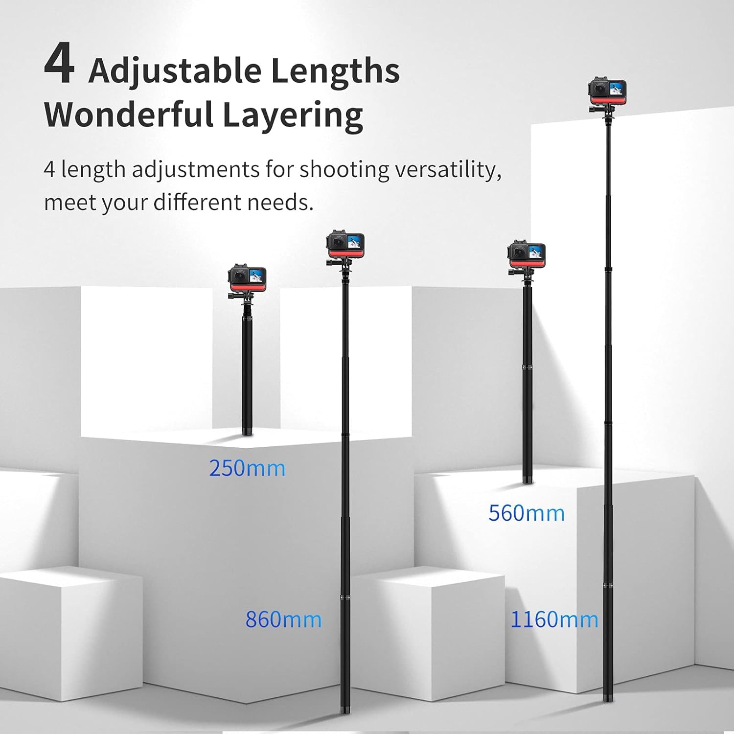 - [Adjustable Length] 4 levels of length adjustable from 62cm to 3 meters, satisfying your various needs on different ocns, perfect for selfie, group photo taking, Vlog video, etc.