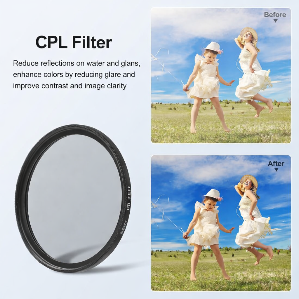 - Package Include: 1 x CPL Lens Filter, 1 x Adapter Ring (52mm), 1 x Lens Cap