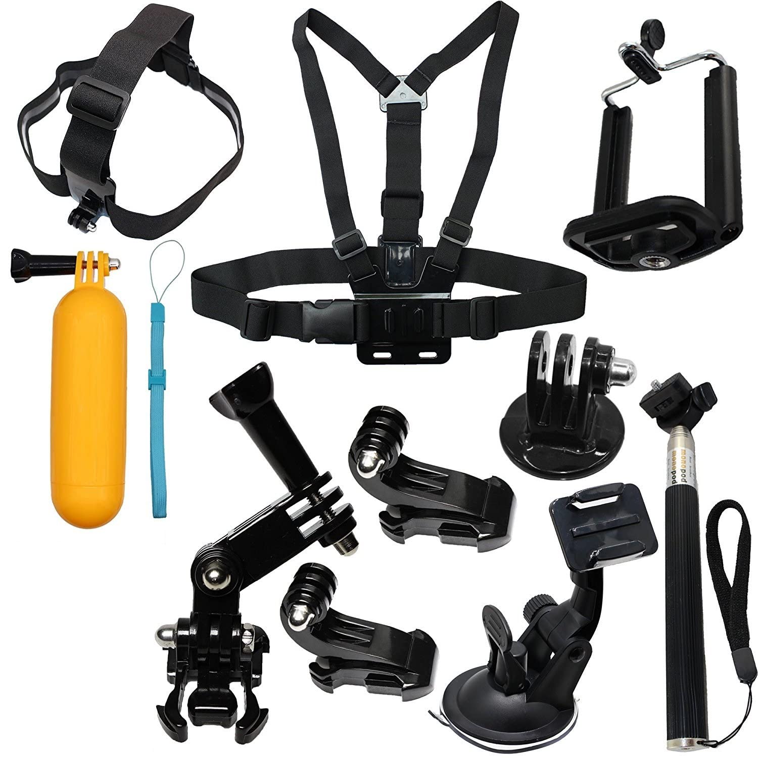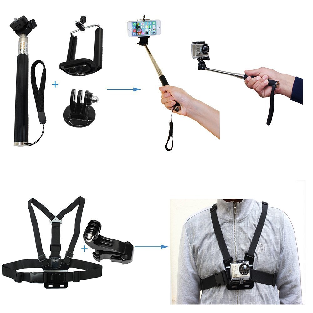 • Package Include: 1 x Chest belt strap mount 1 x Head strap mount 1 x Floating grip 1 x Car windshield suction cup mount + Tripod mount adapter 1 x Three-way adjustable pivot arm 2 x Vertical surface J-hook buckle mounts 1 x Selfie stick + Tripod mount adapter + Cell phone bracket.