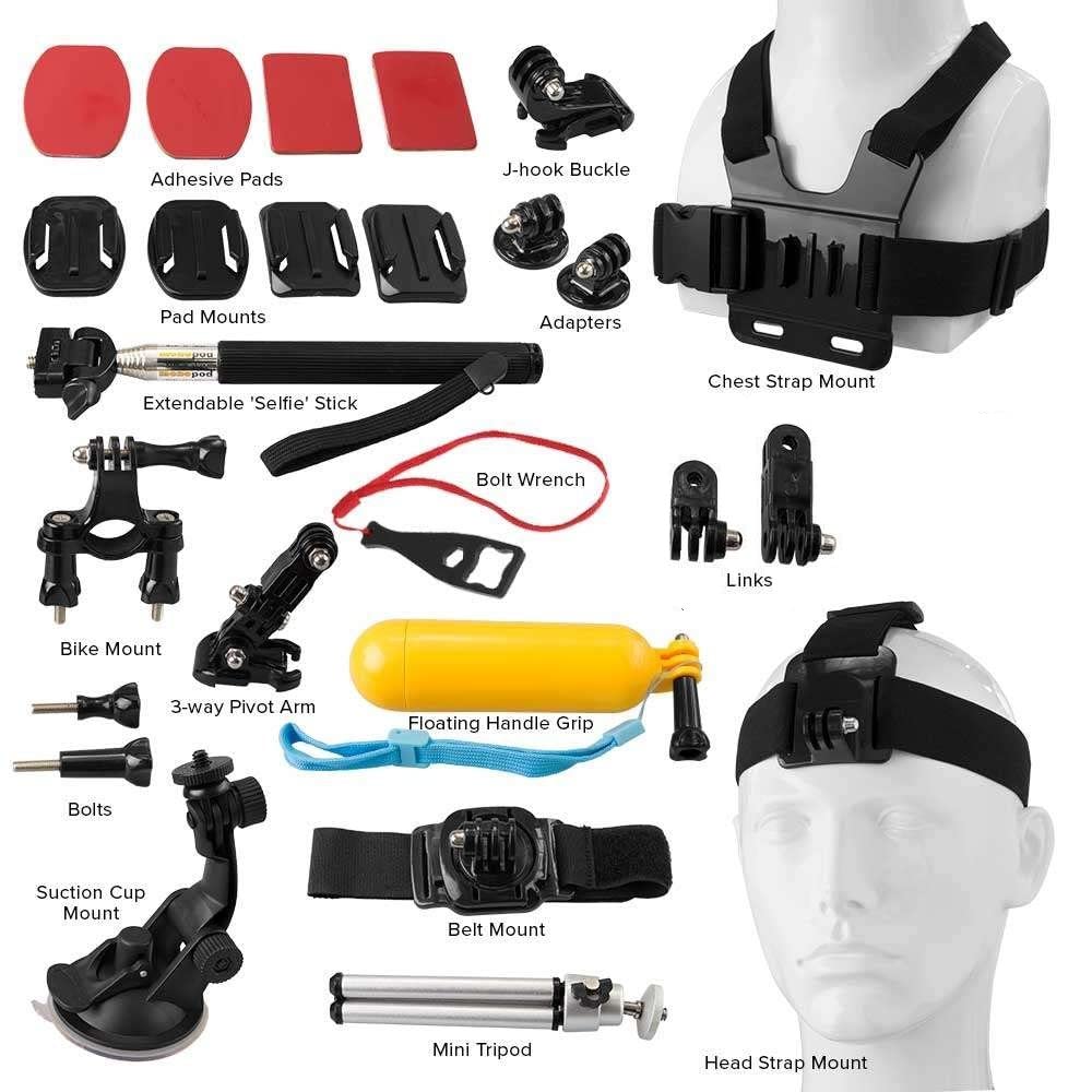 - Package Include: 2 x Flat Mount 2 x Curved Mounts 4 x 3M adhesive pads 1 x Vertical Surface J-Hook Buckle 1 x Chest Belt Strap Mount 2 x Black Tripod Mount Adaptor 1 x Selfie Stick 1 x Bolt Wrench 2 x Links 1 x Bike Mount 1 x 3-way Pivot Arm 1 x Floating Handle Grip 1 x Head Strap 1 x Mini Tripod 1 x Belt Mount 1 x Suction Cup 2 x Bolts.