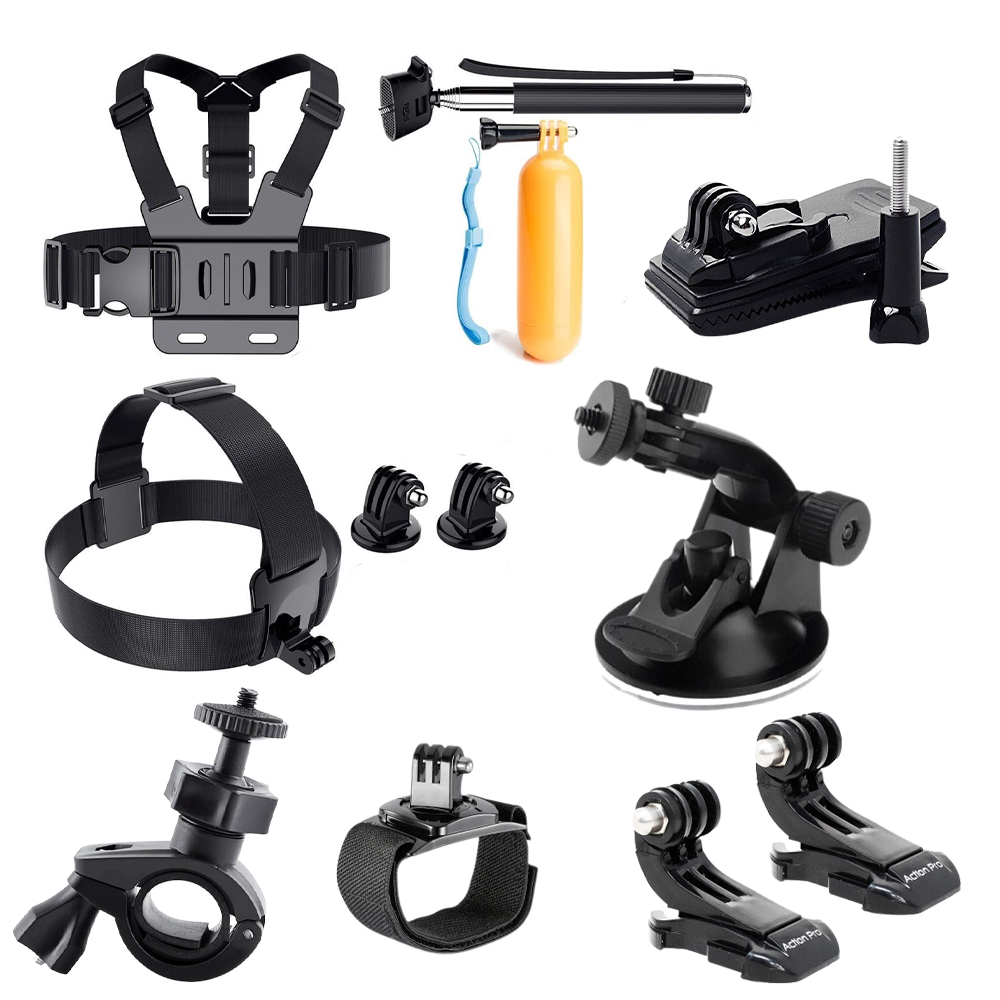 - 1 x Chest Strap 1 x Head Strap, 1 x suction Cup Mount, 1 x Floating Handle Grip, 1 x Extendable Selfie Stick, 2 x Tripod Mount Adapter, 2 x J-Hook, 1 x 360 Rotary Clip Mount, 1 x Bike Handlebar, 1 x Wrist Strap Mount, 1 x Pouch, 2 x Screw.