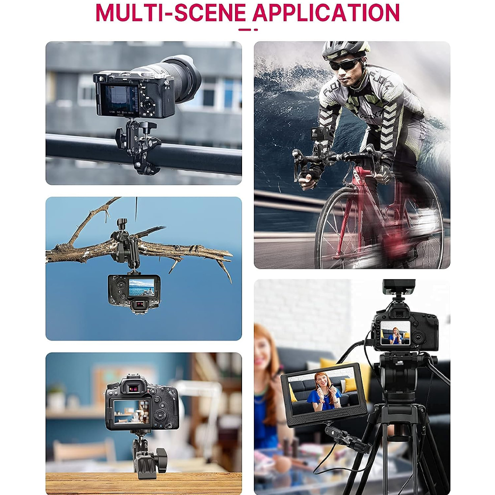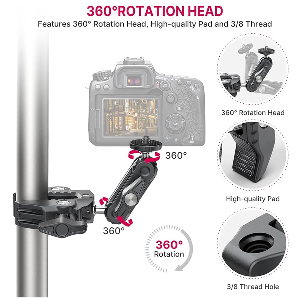 - Standard 1/4” and 3/8” female thread: 1/4” and 3/8” female thread on the back-side of clamp help you to mount a small camera, monitor, LED video light, microphone, speedlite, and more. Come with a gopro adapter, it is also compatible for gopro