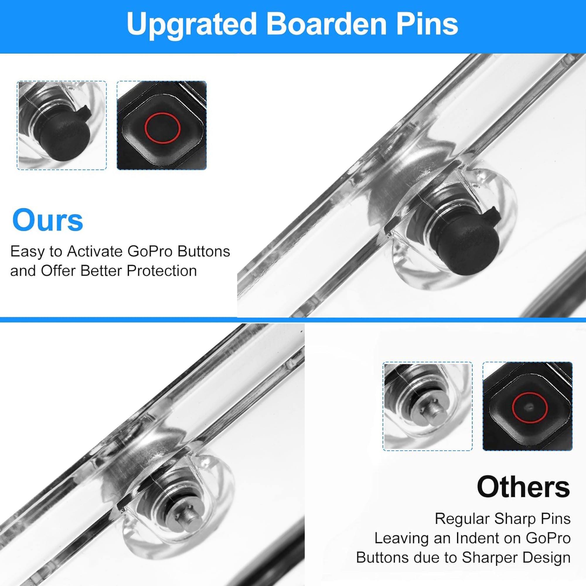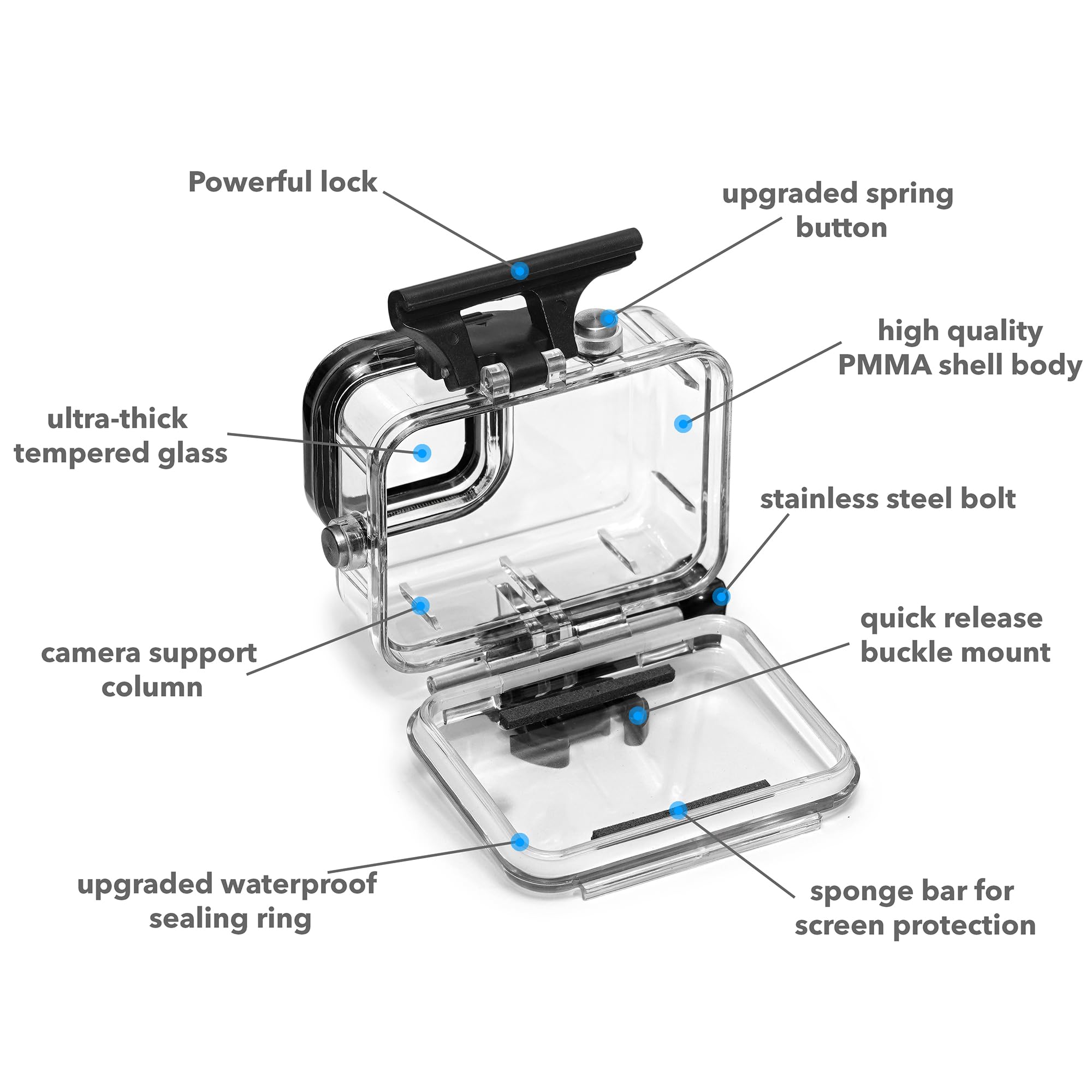 - 【High Light Transmittance】 Featuring 99.99% transimittance, the lens of waterproof housing case allows for crystal clear photos/videos. Back plate with clarity makes selecting camera modes a no guesswork affair and framing shots easy as the LCD is visible.