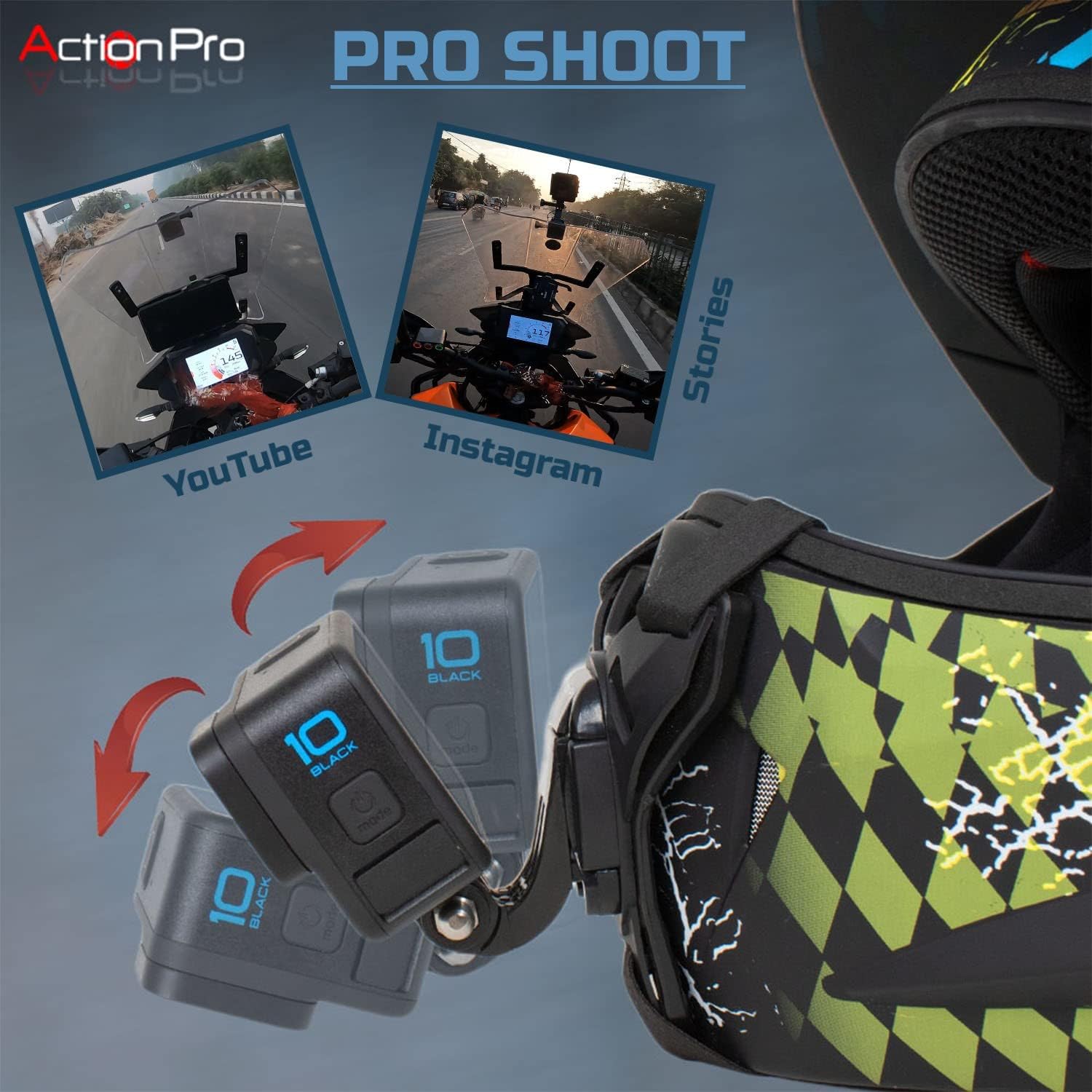 • Made in India: Action pro is a INDIAN brand specialize in making helmet mobile mounts and action camera accessories in INDIA.