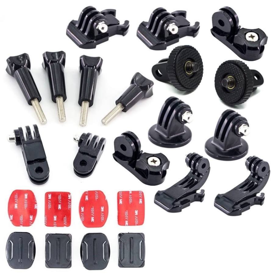 • 2 x J-Hook Buckle, 2 x Tripod Adapter, 2 x Quick Release Buckle, 3 x Screw, 1 x Short Screw, 2 x Adapter, 2 x Three-way Adjustable Pivot Arm Without Screw(one long and one short), 2 x Curved Mount, 2 x 3M adhesive pads for Curved Mounts, 2 x Flat Mount, 2 x 3M adhesive pads for Flat Mounts, 1 x New Mini Tripod Screw Mount Adapter.