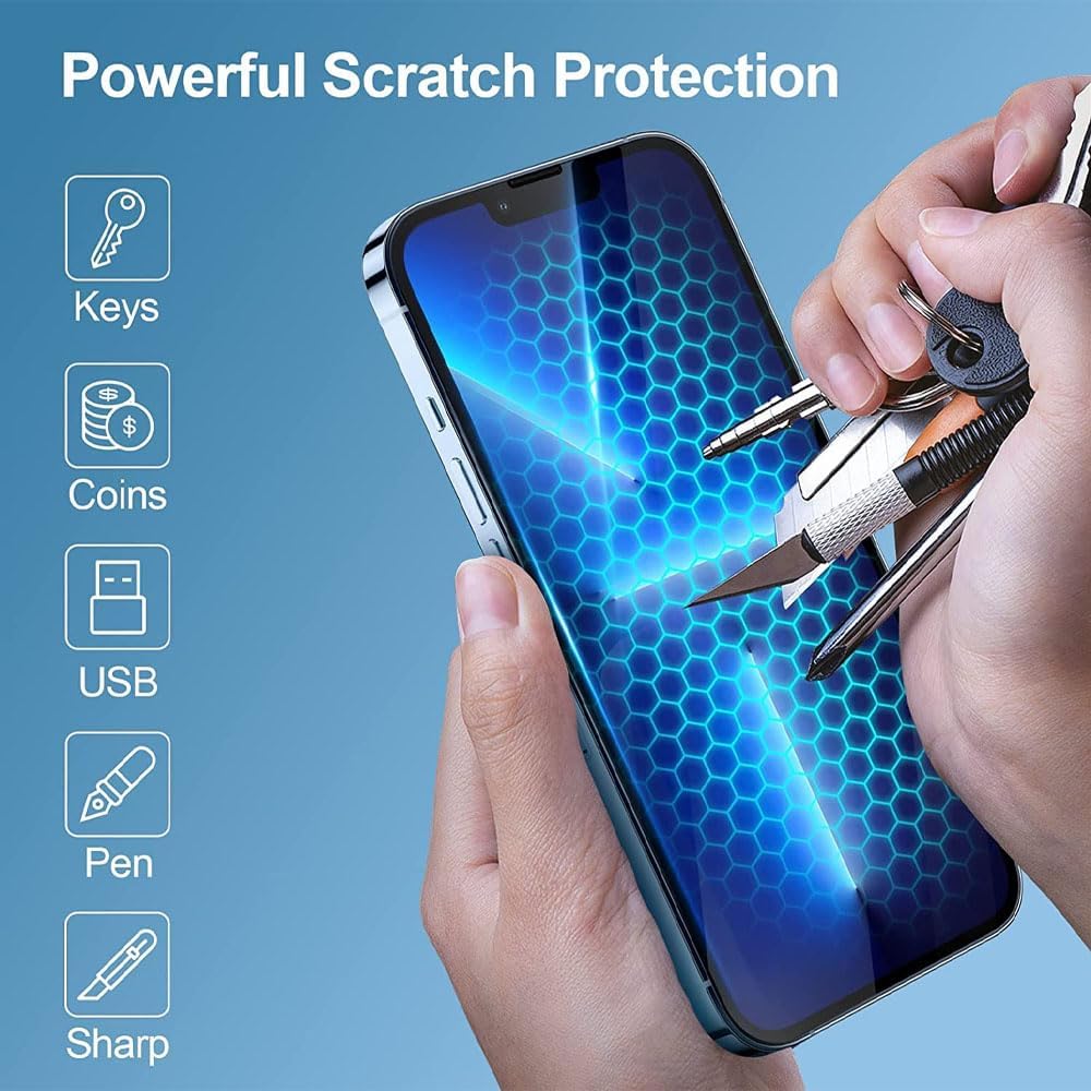 • Scratch proof: This iPhone 12/12 Pro full tempered glass provides the 9H Hardness screen protector can effectively protect your phone from unwanted scuffs and scratches by knife, keys and some other hard substances. The surface of the iPhone 15 Pro Max gorilla glass has a strong hardness and 9H tempered glass protects the entire front display. Don’t get scratches even if scratched with keys in your pocket.
